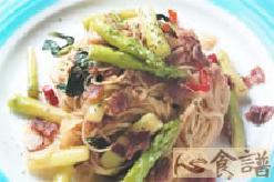 3.热锅,放入适量的橄榄油爆香蒜片,放入培根炒至呈金黄色,加入作法2的芦笋、辣椒拌炒,续放入面拌炒一下,加入鲜味露、鸡粉、白胡椒调味,再倒入鸡高汤,等汁液收一半时放入九层塔拌炒一下,起锅前加入少许橄榄油绕一下即可盛盘,放面上洒些巴西里碎即可。