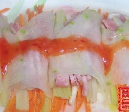 3,把金针菇,培根丝,西芹丝,胡萝卜丝用冬瓜片包起来,然后用牙签别住,如锅蒸5分钟,然后加入加盐的高汤,再闷5分钟。