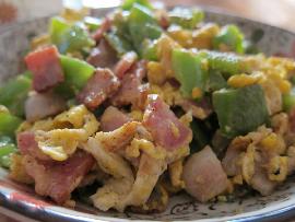 2. 鸡蛋打散后放入尖椒和培根搅拌均匀