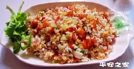 4.加入胡萝卜丁,莴笋丁,盐翻炒两分钟,加入米饭,用锅铲压碎米饭的硬块,使之全部散开,再炒几分钟,要不断搅拌,小心糊锅。最后加入香葱碎起锅。一盘营养丰富的炒饭就做好了,简单好吃营养!