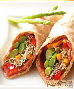 4.取作法3的饼皮摊平,并在饼皮中间偏下方处依序放上作法1的苜蓿芽、作法2的烤培根、作法1的芦笋、青黄椒丝,并依个人喜好淋上适量酱料,将饼皮捲起即可。