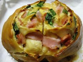 培根3片,葱一根,面粉,酵母,盐,糖,黄油,鸡蛋,黑胡椒粉