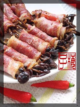 很喜欢网上食友的聚会.特别是到各个家里去闹的时候,可以学到很多的东西.这些食友们有江西的/湖南的/茂名的/湖北的/河南的/客家的.如果每人都带一个菜时那可是风味各异.各有绝招啊.这个茶树菇卷就是一次聚会时国会做的.平常吃得最多的培根卷里都是卷金针菇或芦笋之类的蔬菜.吃着很不过瘾.这个干茶树菇的干香带着培根的肉香,真的相配极了.当时满桌的菜就它给我留下最深的印象.虽然卖相不是很好.现在也成我饭桌上的常客了.