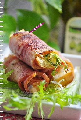 1.面包切条,卷在培根里加入喜欢的蔬菜。