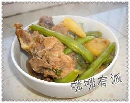 3.在锅中烧适量子的油,下入葱花爆香,然后把芸豆放入,翻炒,然后再加入土豆和骨头,最后加上适量的水并加盐调味,开锅再过一会,等土豆变软就可以出锅啦!!!