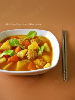 5.待蔬菜煮好后放入适量的咖喱块,这时一定要小火,并不断地搅拌至咖喱融化,同时下入肉丸,用小火稍加炖煮即可,期间还是要稍加搅拌以免糊底。(咖喱块加入后会使汤汁变得很浓稠,所以锅里的汤汁一定不要太少。)