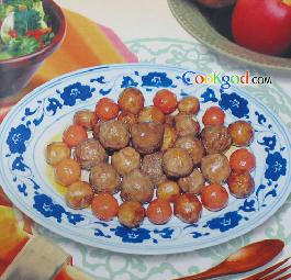 材料主料:牛肉200克,胡萝卜球、山药球各75克。配料:鸡赁1个,淀粉25克,面粉25克。调料:料酒15克,酱油15克,精盐4克,葱、姜汁30克,味精4克,白糖3克,五香粉1克,泡打粉0.5克,汤500克,色拉油900克,鸡油20克。作法1、肉内加料酒5克、精盐2克、葱、姜汁15克、味精2克、五香粉、泡打粉、鸡蛋、面粉、淀粉10克充分搅匀。2、肉馅挤成丸子下入五成热油中炸硬捞出。再下入山药球炸黄捞出。3、勺内加汤及余下料酒、酱油、葱、姜汁、精盐、白糖、下入肉丸略烧。4、下入胡萝卜球、山药球烧至软烂,汤浓。5、加味精,用淀粉勾芡,淋入鸡油出勺装盘即成。