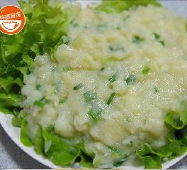 3坐锅热油,油温五成热时倒入蒸好的土豆快速的翻炒,一定要快,不然会粘锅,一边炒再一边加入少量的清水,然后快速的把锅里的土豆碾碎,一边粘一边加水,这个过程一定要耐心,一直碾到土豆全部变成均匀的土豆泥,没有块状就可以了,要不停的少量加水 因为很容易糊锅,等到土豆快变成泥的时候加入香葱翻炒均匀,然后调入盐和鸡精就行了。