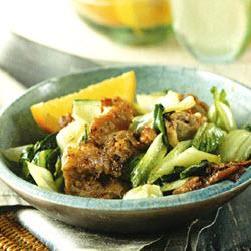 不甜的雪莉酒或米酒3汤匙,酱油2汤匙,太****(粟粉)1汤匙,黑麻油1茶匙,黄砂糖1茶匙,黑胡椒粉1/4茶匙,无骨猪里脊肉(枚头肉)450克,切薄片,蔬菜油2汤匙,青江菜(小唐菜)500克,切块,削皮的姜末25克,大蒜2瓣,切末