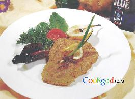 (2)将猪排拍上面粉,在打匀的鸡蛋中浸一下,再沾上面包糠,放入煎盘,用黄油煎至色金黄。