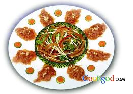 3、蛰头放温水中泡60分钟泡去盐分洗净沙粒,改刀成0.1厘米厚的片后入沸水中焯8秒钟捞出,迅速入冷水过凉,捞出放入盆中,加入盐、味精、白糖、陈醋、蒜泥15克、蒜末、香油2克拌匀摆呈树叶形状摆在盘子边上。