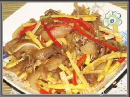 市场上有做熟的猪耳朵卖,方便买回去凉拌。凉拌吃多了俺得想想换个口味,拿来炒竹笋吧。猪耳肥肉多,油多炒笋正好,那才香。
