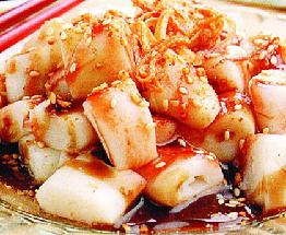 4. 享用时,将猪肠粉蒸热切块,淋上适量虾膏酱、甜酱、辣椒酱和炸葱,再洒上炸葱片和芝麻便可。