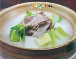 2、取净锅上火,放入清汤、山药、猪肚、姜、芥菜大火烧开转中火煲45分钟调味即成。