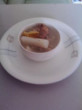 4:大火煮开,改用小火1个半~2个小时,在最后面的10分钟加入淮山,新鲜的准山易熟不需要煮太久,关火前加入盐就可以了