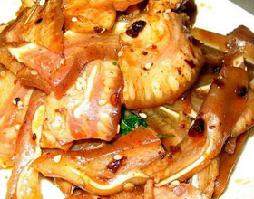 1.猪耳刮去耳垢,除去耳边上的毛,洗净后切去耳根肥肉。