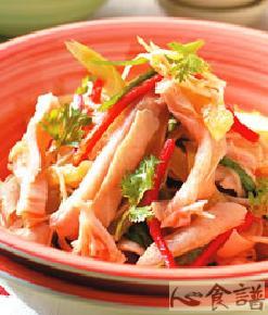 5.取一锅,放入葱段、姜片、八角、米酒、水煮沸后,放入作法4的猪肚,以小火焖煮约1小时,待凉后取出切丝,混合上作法1的调味酱和酸菜梗丝、嫩姜丝、辣椒丝、蒜苗丝即可。