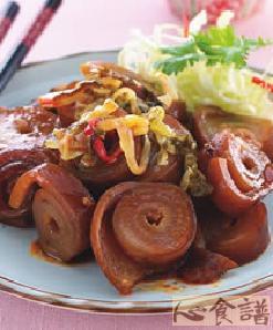 1.猪皮先以水沖洗干净,放入滚水中略汆烫后捞起,烧去皮上的细毛,再捲成圆筒状,并以棉线绑紧。