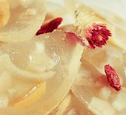 猪皮润肌肤,助发育,止血,抗老防癌,其营养也很丰富。所含蛋白质是猪瘦肉的1.5倍,碳水化合物是猪瘦肉的4倍,脂肪为猪瘦肉的79%,其所含有极丰富的胶原蛋白质,有益延缓人体衰老和抗癌作用。花生的营养价值的粮食类高,可与鸡蛋、牛奶、肉类一些动物性食品媲美。它含有大量蛋白质和脂肪。花生中含有―种儿茶素,有抗衰老的功效。花生中所含人体必需氨基酸,人体利用率可达98%,其中赖氨酸可以防早衰。此皮冻常食可滋润肌肤,增白颜皱。适用于肌肤干燥,粗糙起皱及黑色素沉着。