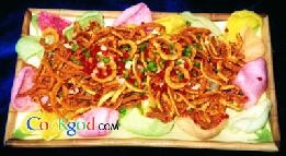 特点 干香酥脆,椒盐味浓。 注 若直接用鲜猪皮切条,加食粉、盐、味精、葱、姜、料酒腌渍4小时,冲洗净后入五成热油中,中火浸炸,至猪皮起小泡、色金黄时也同样酥脆,只是口感不如炖出的更醇厚。若炸酥后用避风塘料炒则成为“避风塘猪皮”。