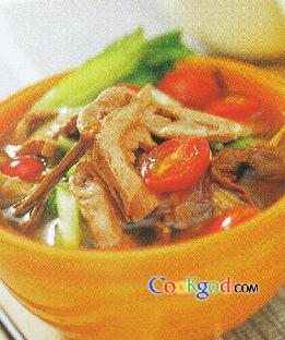 4、锅中加2大匙色拉油烧热,下入葱花、姜片炝锅,倒入猪心翻炒,烹入料酒,加酱油炒至上色,倒入8杯高汤,下入茶树菇、精盐煮沸,再放入小番茄,油菜续煮5分钟,加味精调味,淋大蒜油即可。