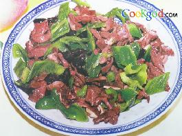 3、锅内放入油30克,下入葱末、姜末炝香,下入猪心、木耳、青椒炒匀至熟,烹入用余下的调料(不含油)对成的芡汁翻匀,出锅装盘即成。
