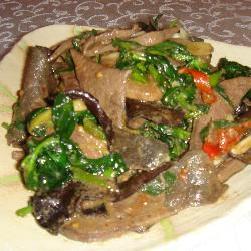 5.锅置旺火,放油烧至七成油温,下泡辣椒炒香,加姜片,蒜片炒几下,再将肝片抖散放入锅内,迅速翻炒十八下(数着炒),下木耳片、豆苗、葱炒断生后立刻将芡汁倒入,炒翻均匀至猪肝熟后收汁起锅装盘即成。