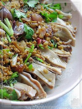 这个菜一上桌LG就笑了.叫儿子看是哪盗版的.确实是在一客家菜馆盗版的.那天不想做饭.他说带我去一家餐馆吃.当时吃到这个菜时我就想了回家自己做.因为我觉得师傅做得太咸了.这里所说的葱油不是香葱.是干葱. 湛江特产沙姜在这是主角.据说可以补血.吃过这种姜的人就知道这姜的香味有多特殊.听说别的地方是种不出来的,所以不常见到.有段时间我们家吃沙姜白切鸡.LG可以把剩下的沙姜油拌饭吃.这是经过我改良的做法.明天我跟朋友们就要去吃这家餐馆.大家可以尝尝了.