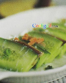 3、原汁倒入锅中,再加入清汤烧滚后,下入调料调味,水淀粉勾琉璃芡,撒入蛋清液、碎芹叶搅匀,淋在青瓜夹上即可。