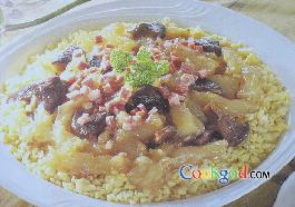 4.锅中留下2大匙油烧热,爆香姜末、红椒片和香菇片,放入蹄筋,喷上B料拌炒均匀,加入C料煨煮至汤汁收干一半,撒上葱花,盛在绿豆仁上,再撒上火腿丁即可端出。