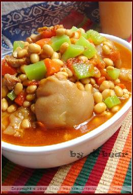 猪手2个,黄豆,姜,番茄,番茄酱,胡萝卜,莴笋,糖少许,盐适量