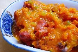 3.将南瓜泥用水、猪骨汁或鸡精开一个芡汁淋在猪手上便成。