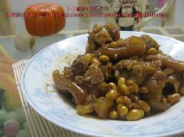 猪手半个,泡好的黄豆,老抽,生抽,蚝油,蒜,姜