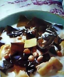 主料:海带(发好的)100克,花生米50克,猪手200克,生姜,葱各10克。清汤500克,盐20克,味精10克,白糖5克,胡椒粉少许,鸡精粉5克。
