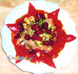 猪前蹄1个(约750克),泡椒50克,泡仔姜50克,酸萝卜100克,雪豆20克(又称白豆、香豆,种子多为白色,肾形,较大,长约2.5厘米,豆香较浓郁,为诸豆之冠),红尖椒10克。调料葱花10克,葱油50克,红油15克,花椒8粒,胡椒8粒,盐5克,味精3克,高汤750克,川椒6克。