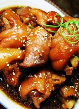 猪蹄中含有丰富的胶原蛋白质,脂肪含量也比肥肉低,近年在对老年人衰老原因的研究中发现,人体中胶原蛋白质缺乏,是人衰老的一个重要因素。它能防治皮肤干瘪起皱、增强皮肤弹性和韧性,对延缓衰老和促进儿童生长发育都具有物殊意义。为此,人们把猪蹄称为“美容食品”和“类似于熊掌的美味佳肴”。