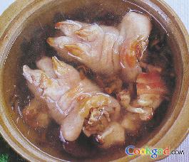 2、大火浇沸,放绍酒,改用小火煲l小时左右,直至猪手煲烂,用精盐、味精、鸡精调味即可。