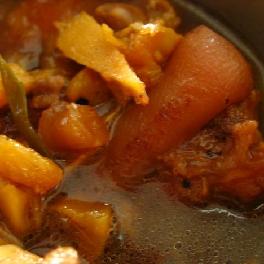 锅内放少许油,放姜片炒出香味,将猪蹄放到锅中,加水,酱油,稍焖一会;