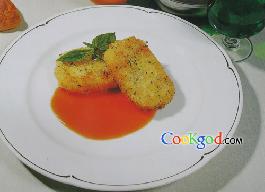 (6)将肉饼放入五成热油锅,炸至呈金黄色,装盆,淋上(4)即可。