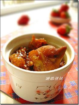 3.再注入冷水,没过猪蹄,大火烧开后,加上蹄筋鱼鳔小火炖至黏稠。