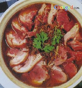 2、沙锅底下放入葱、姜,再放入咸猪手,然后加水、绍酒,大火烧开,小火炖烂,再放入百叶、OK酱、精盐、味精、鸡精调好味,再烧5分钟即可。