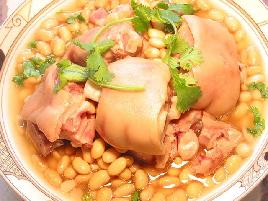 2.每只猪脚锯成六块,飞水后放入大砂锅,加水没过,大火烧开,撇去浮沫,加姜、盐、花椒、大料、料酒,改用小火炖3小时,加入黄豆继续用小火炖2小时,加少许糖,再炖十分钟即成。