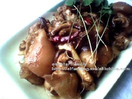 3.热锅凉油下葱、姜、蒜、辣椒煸香倒入猪手加少许盐、酱油、料酒、白糖、少许水翻炒至变色入味、淋明油出锅装盘即可。