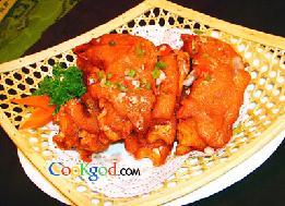 1、猪手纵切一分为二,加调料A上笼大火蒸3小时,取出拍生粉,入六成热的油锅内大火炸1分钟捞出,备用。