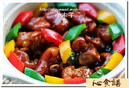 猪手斩小块,加上姜片和一粒八角放高压锅煮十分钟,待凉后取出,炒锅放油煮溶几粒冰糖,放猪手块翻炒,加约两汤匙的花雕酒和少量肉汤略煮一会儿,放盐,生抽调味。砂锅里预先放入用油盐水焯过的生菜垫底,再倒入猪手即可。加点菜垫底可以吸收肉汁,一起吃就不会腻啦。