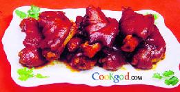 特点 色泽红艳,酥而不腻。 创新点 此菜是根据东北菜“酱猪手”进行改良而成。既要保持菜的风味,又要能符合湖南人的口味,还要把猪手做得油而不腻。看似简单,实则不易。