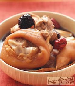 猪脚900公克,水800㏄,药膳:1片,川芎3片,黄耆20公克,熟地1/2片,桂枝少许,蜜甘草3片,蔘鬚15公克,黑枣3个,红枣5个,枸杞10公克,米酒300㏄