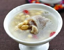 将黄豆入盆内,先将坏粒与砂石捡出,然后加入冷水豆粒洗净,即以清水浸泡备用,猪脚洗净放入中型铝锅内,加入二大碗水,一大匙米酒,一大匙白糖,一大匙白醋,即将锅置火上,初用大火烧滚,撇去泡沫,续用小火烧约半小时,加入黄豆及一大碗水慢炖,见黄豆已烂,即加入白酱油一大匙,盐半茶匙,胡椒粉少许,拌匀调味,即可盛入大碗内供食。