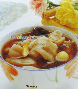 用料猪蹄400克,老藕400克,莲子20颗,红枣12个,陈皮10克,精盐、姜片各适量。
