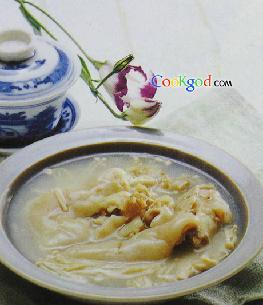 特点 肉酥烂鲜香,清淡不腻。 功效 此汤以金针菇配猪蹄,具有安五脏、补血益气、健胃、消炎利尿的作用,去烦热,利湿热,止渴解烦,可预防小便赤涩、风湿性关节炎、痈症等。